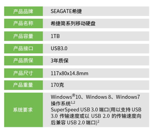 商品名稱:希捷(Seagate) 移動硬盤 1TB USB3.0 2.5英寸 高速 輕薄 便攜  STJL10004001TB移動硬盤