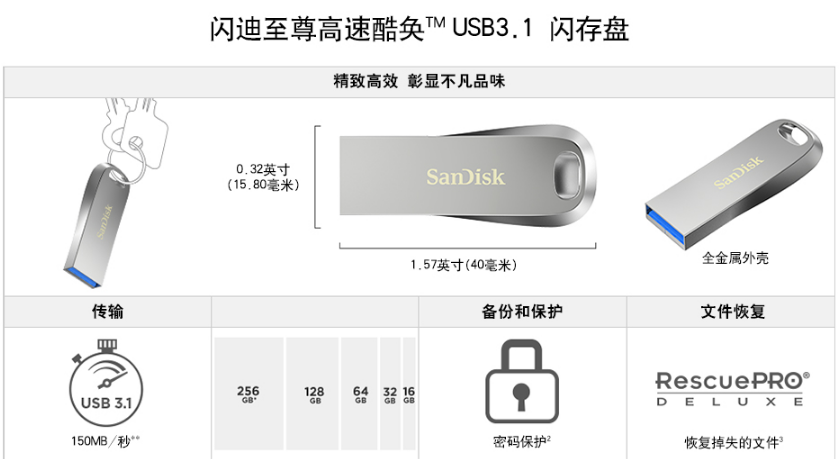 商品名稱:閃迪(SanDisk)USB3.1高速U盤CZ74酷奐銀色金屬外殼USB3.1 閃迪金屬U盤64G