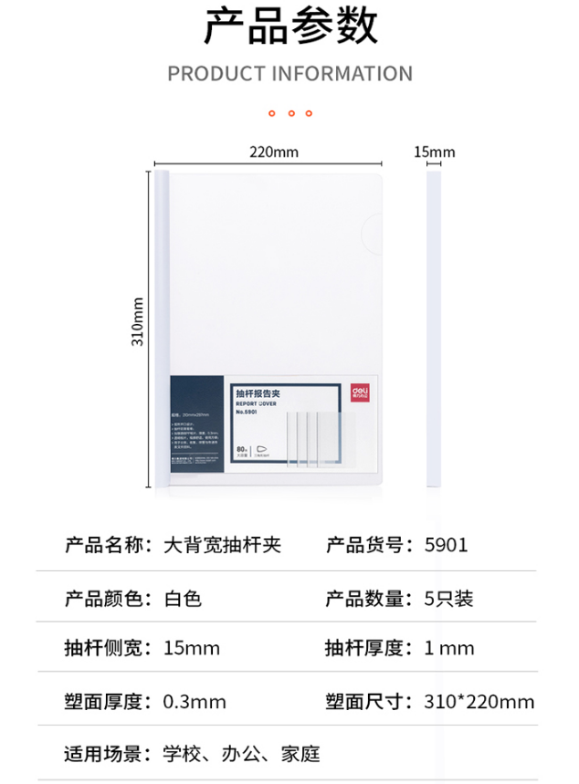 商品名稱:得力(deli)5只A4加寬加厚15mm抽桿夾文件夾 拉桿夾資料簡歷夾 得力拉桿夾白色5901