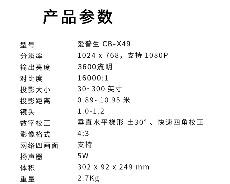 商品名稱:愛普生(EPSON)CB-X49 投影儀辦公掛式 投影機 商務投影儀 會議培訓 (含100英寸4:3電動幕布 白色)愛普生CB-X49 投影儀