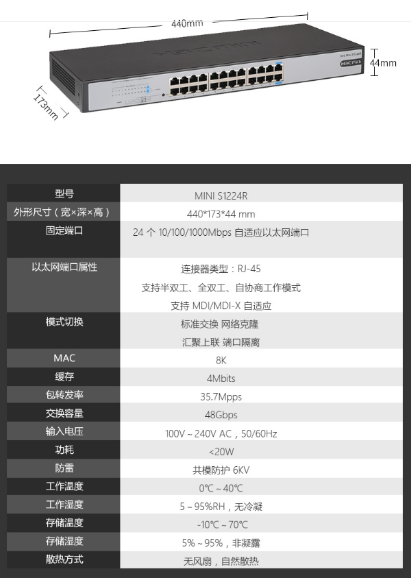 華三 (H3C) 24口全千兆交換機MINI S1224R 可上機架即插即用華三24口千兆交換機MINIS1224R