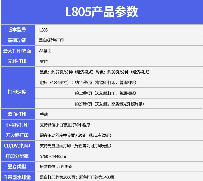 商品名稱:愛(ài)普生(EPSON)墨倉(cāng)式彩色噴墨打印機(jī)商用辦公原裝連供照片打印機(jī)A4幅 愛(ài)普生 L805