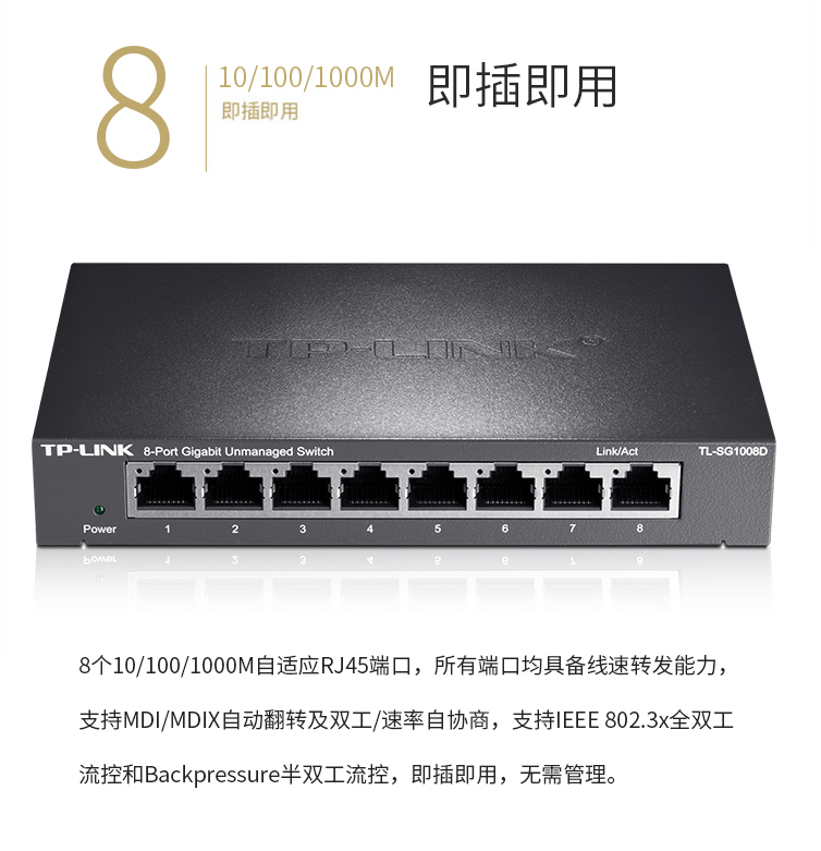 TP-LINK 8口千兆交換機 企業(yè)級交換器 監(jiān)控網(wǎng)絡(luò)網(wǎng)線分線器 TL-SG1008D